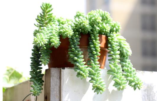 【六一儿童网导读】玉缀,中文学名翡翠景天景天科景天属(佛甲草属)常绿或半常绿多肉植物。植物匍匐下垂,青绿色,表面附白粉。叶小,多汁,纺锤形,紧密重叠,似松鼠尾巴。花小,深玫瑰色,春季开放。
