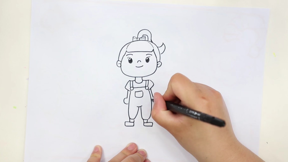 ①画女孩子,画上大眼睛和五官,画上蝴蝶结和头发,画上背带裤;