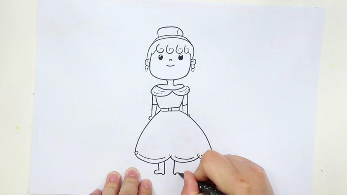 ①画公主娃娃,画出头部和五官,画上公主裙,画上鞋子;