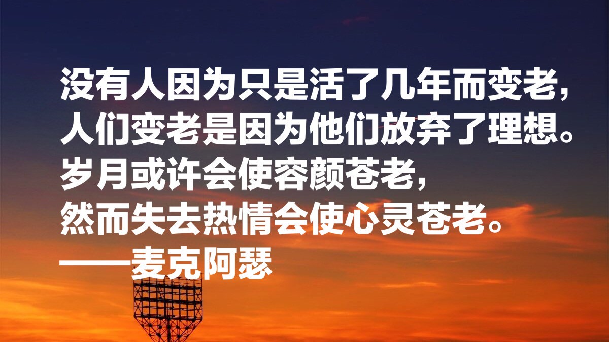 没有人因为只是活了几年而变老,人们变老是因为他们放弃了理想。岁月或许会使容颜苍老,然而失去热情会使心灵苍老。——麦克阿瑟