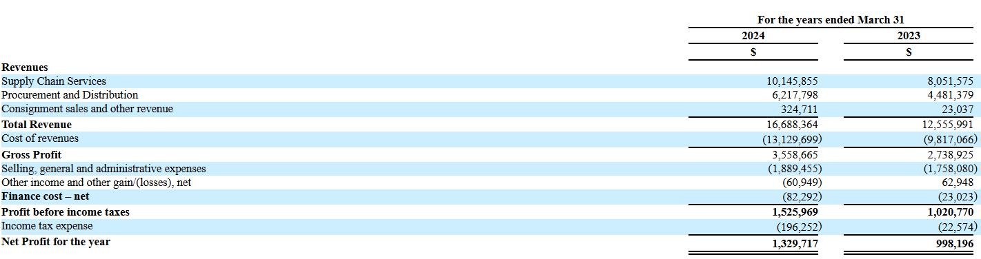 2023-2024财年(截至3月31日),港药数字科技营收分别为1256万美元、1669万美元,相应的净利润分别为100万美元、133万美元。