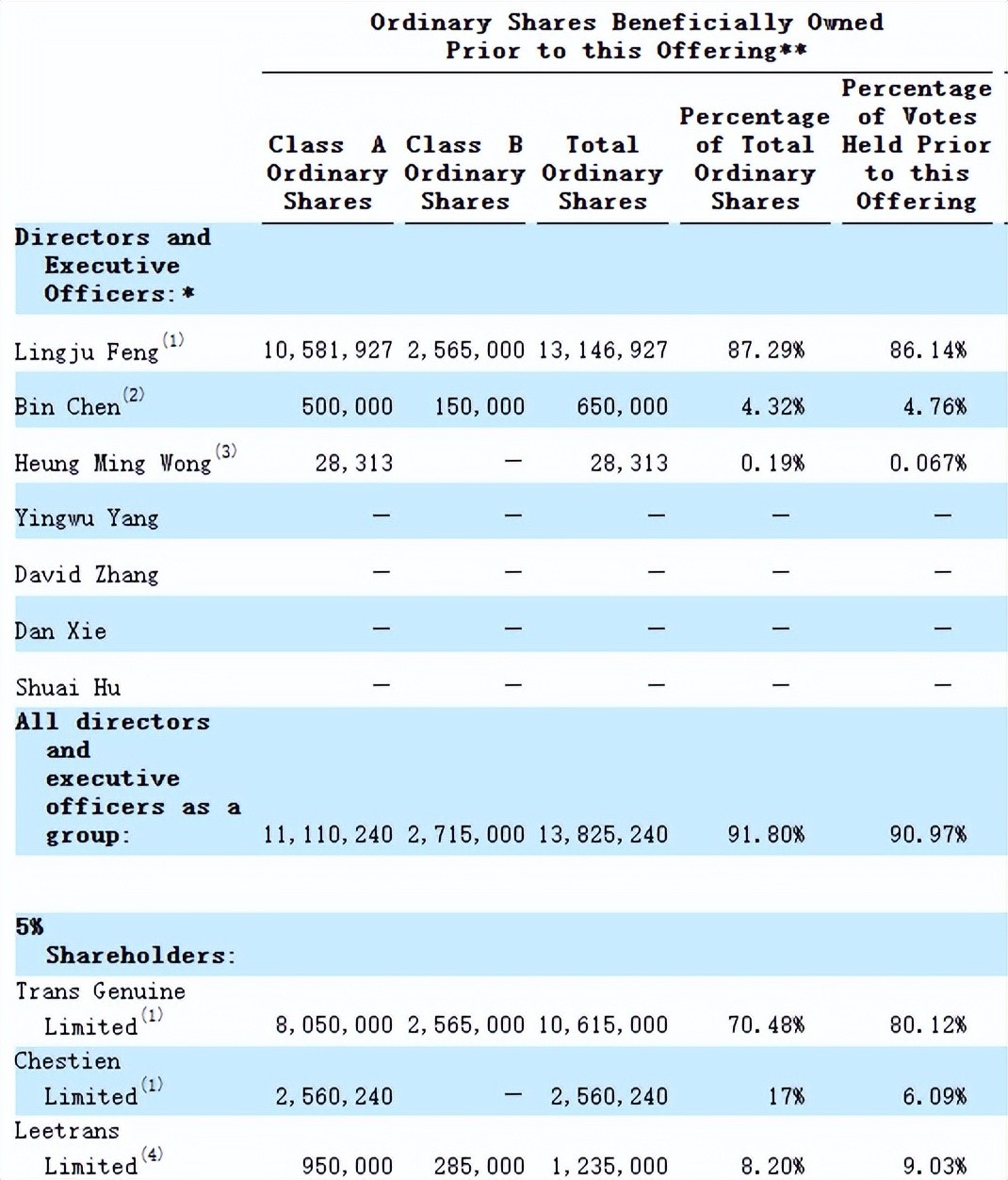 IPO前,冯凌炬持股87.29%,拥有86.14%投票权。Bin Chen持股4.32%,拥有4.76%投票权。Heung Ming Wong持股0.19%,拥有0.067%投票权。Lingli Feng持股8.2%,拥有9.03%投票权。