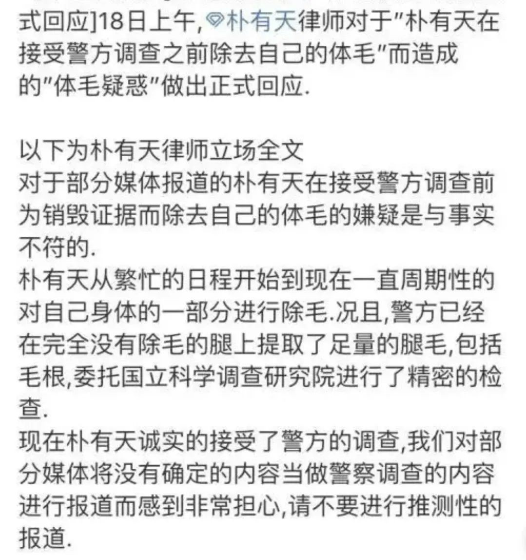 事实上,因涉毒被调查的韩娱艺人为了销毁证据,很多人都会通过脱毛的方式达成目的。例如,朴有天就是一个案例,面对各种证据,他还召开记者见面会说自己没有涉毒行为。直到精密检测结果出来了,他依旧否认,并狡辩称“正在确认这些违禁药品是如何进入我的体内”。从这种套路来看,权志龙目前的言行与当年的朴有天十分相似,因此警方怀疑他存在销毁证据的嫌疑。而且,警方会等到精密结果出来后,再次传唤权志龙。