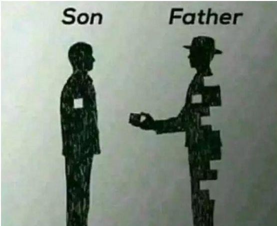 这张图是一个父亲和一个儿子,儿子身上只少一个方块,因此,残缺不堪的父亲就从自己身上取下来一块交给儿子,可是父亲的身体本身就已经所剩无几了,这也是最感动的一张图片,父亲费尽心思的,把自己养大成人可是自己却一直在啃老,我们什么时候才能,回报自己的父母,能好好孝敬他们,等到我们有能力的时候,他们还能够支撑下去吗?