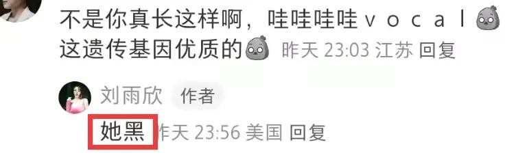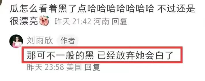 但刘雨欣看起来比较谦虚,在评论区吐槽女儿太黑了,还表示已经放弃她会有白的机会了,不过,这吐槽之外依然能感觉她到满满的母爱。