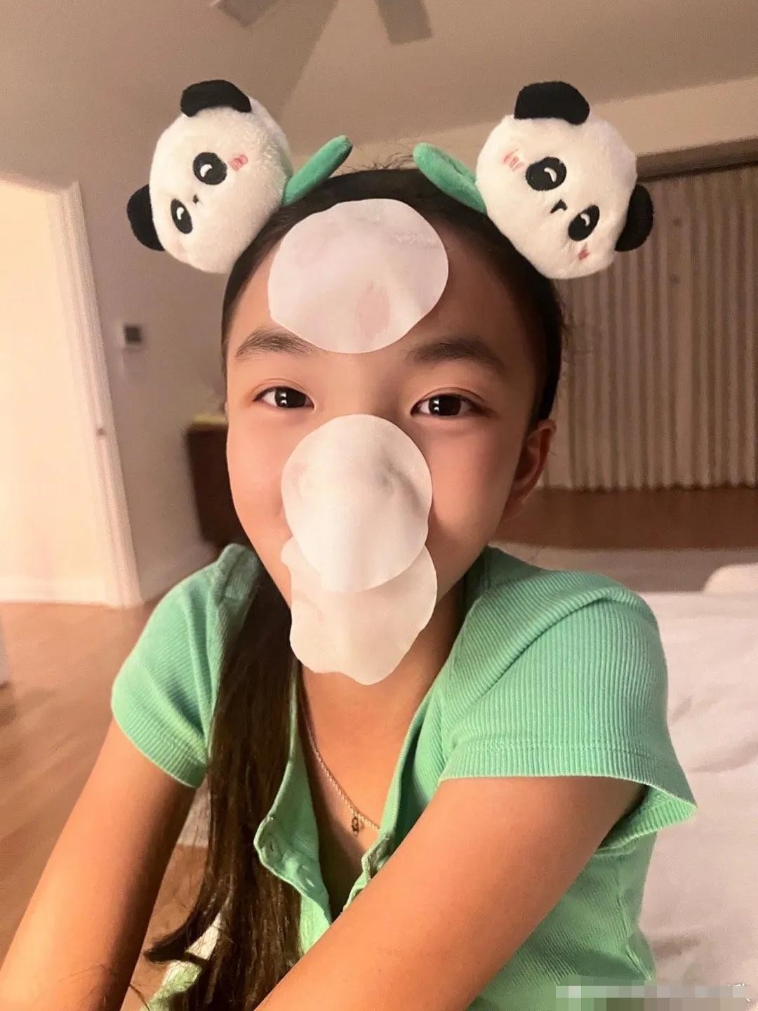 照片中的瓜瓜俏皮可爱,也开始爱美了,喜欢穿五颜六色的衣服,头上戴着熊猫发箍,脖子上还戴了项链,正在给脸部做美容。