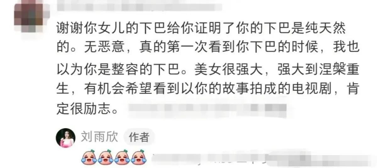 刘雨欣这次晒出和女儿的合照,也可以让之前那些质疑她整容的人闭嘴了,有网友评论你女儿的尖下巴证明了你的下巴确实是纯天然的。