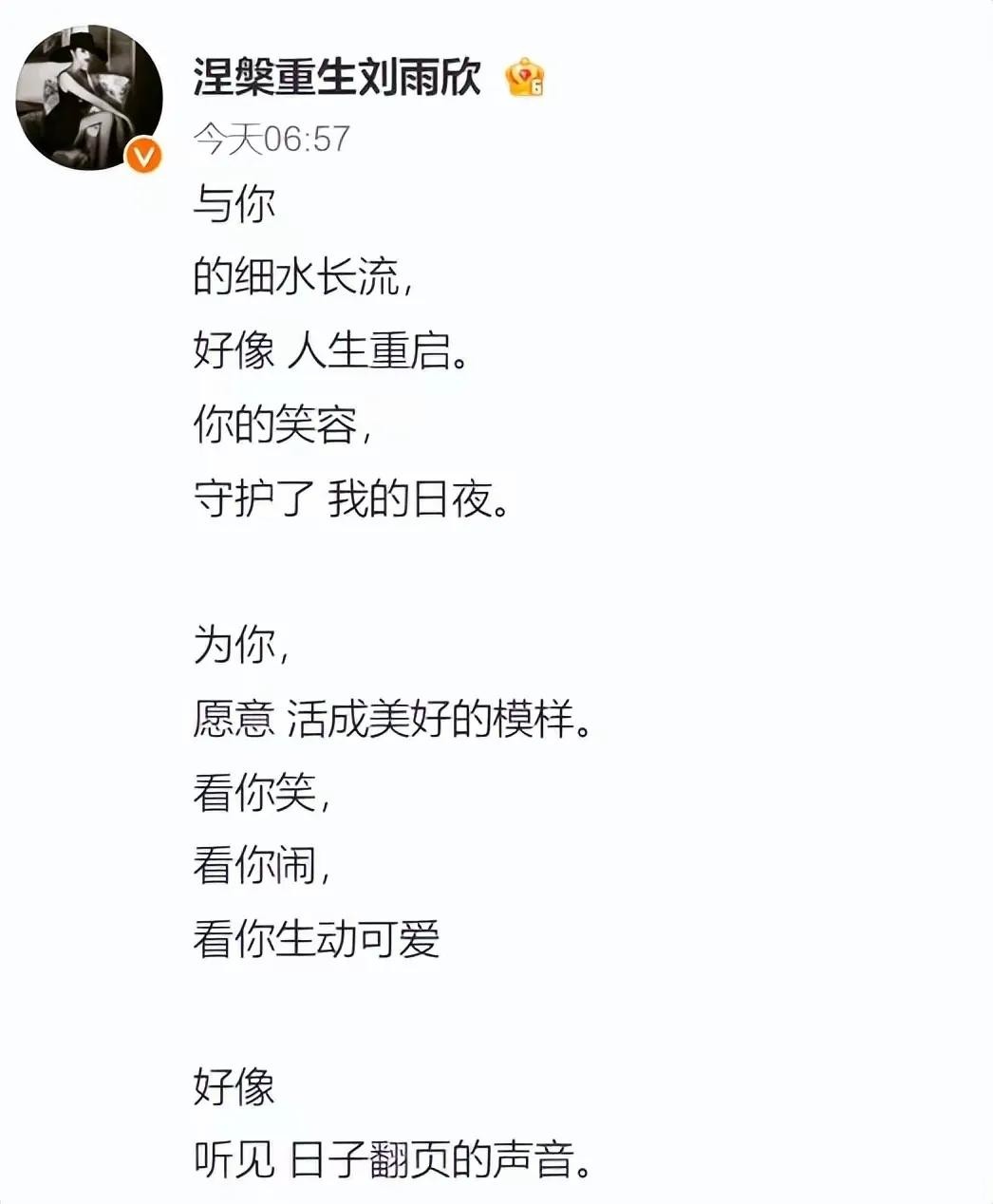 刘雨欣还写了一首短篇诗歌,感慨和女儿在一起后细水长流的生活,称有了女儿后,人生就重启了,为了女儿,愿意活成最美好的样子,看见女儿的一颦一笑,生动可爱的模样,一切都知足了。