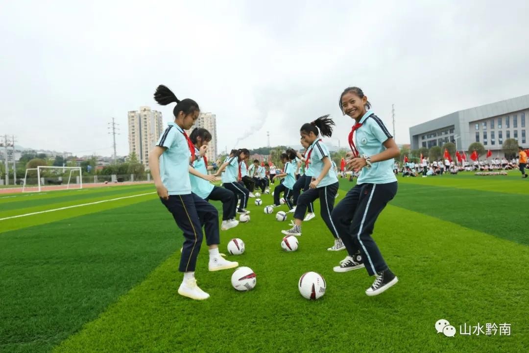 移民搬迁子女在福泉新三中校园足球场踢球,感受新校区魅力 肖伟 摄