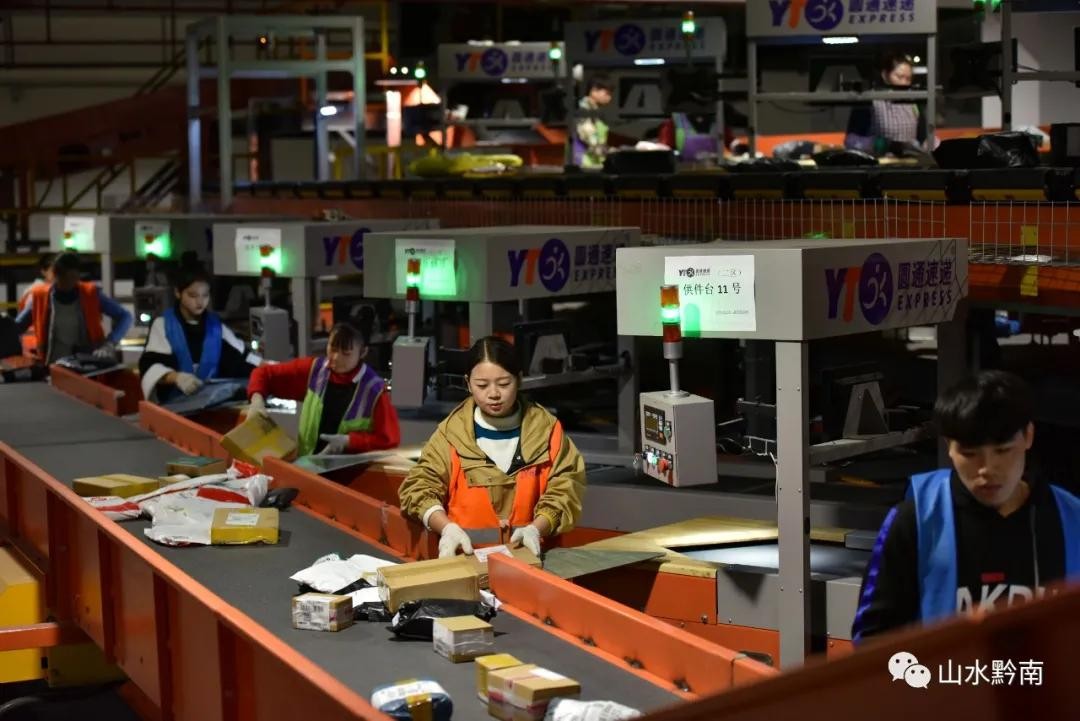 拣配员在贵州快递物流聚集区圆通速递自动化分拣流水线上工作 龙毅 摄