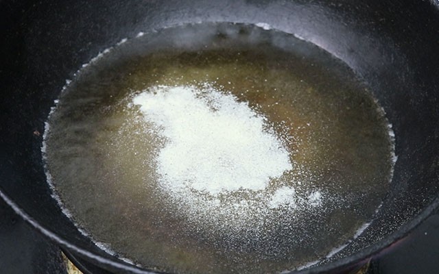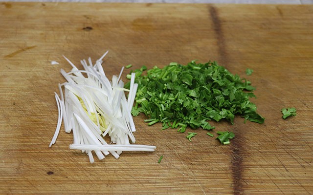 第五步:往锅中加入陈醋(可以多一点)、芝麻香油,搅匀后再大葱丝和香菜末,用勺子再次搅拌均匀即可出锅。