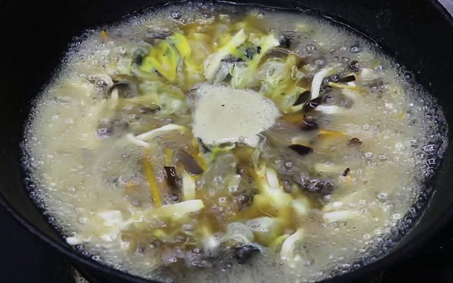 第四步:待锅中水开后下入焯好水的食材,大火再次烧开后,加入适量水淀粉勾芡收汁,汤汁浓稠后再加入鸡蛋液并用勺子轻轻搅动拨开。