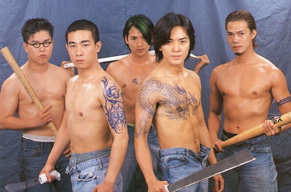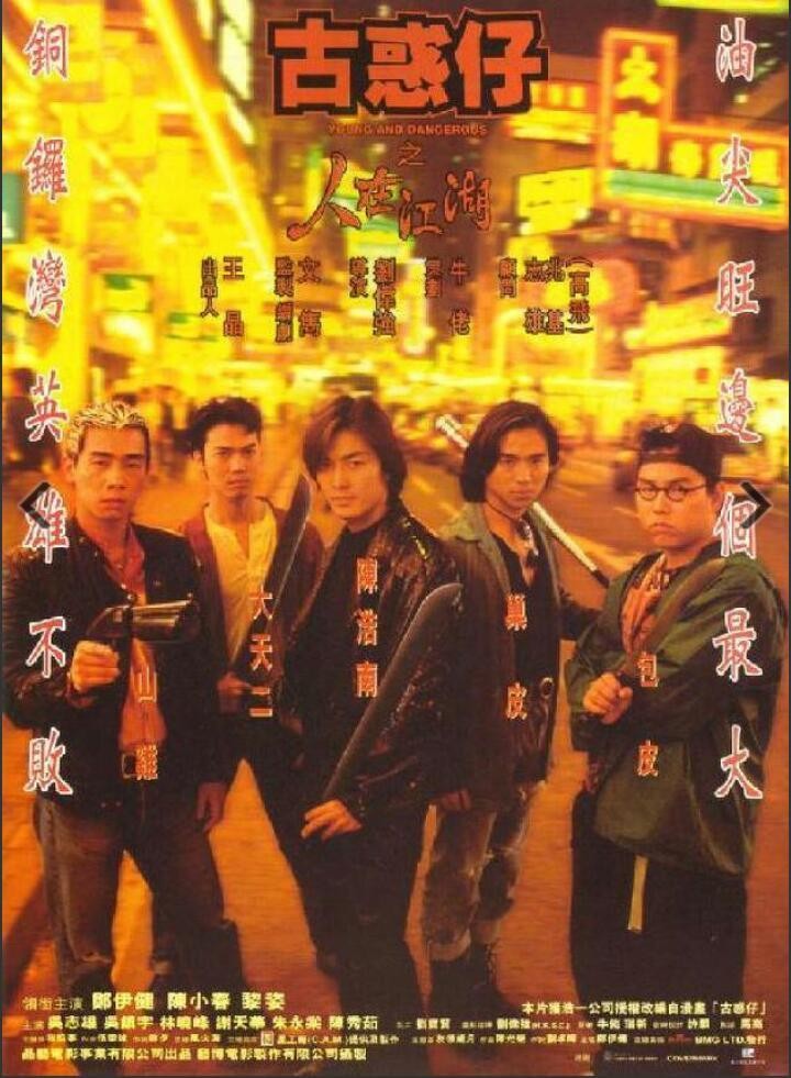 《古惑仔之人在江湖》的主要角色由左到右为「山鸡」陈小春、「大天二」谢天华、「陈浩男」郑伊健、「巢皮」朱永棠、「包皮」林晓峰。这部电影在整个华人圈造成大轰动,「古惑仔风」顺势成为潮流!