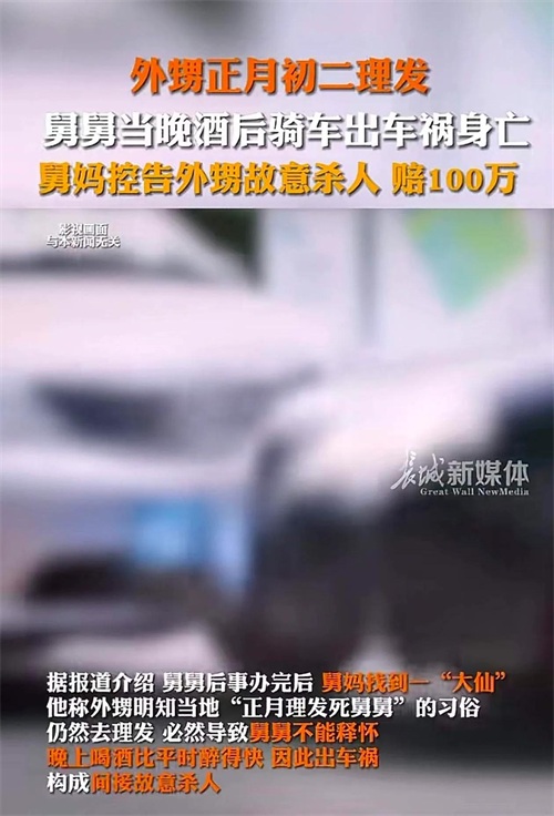 据报道介绍在舅舅后事办完后,舅妈在当地找了位大仙。那位大仙声称外甥明知当地有个“正月不能理发,不然死舅舅”的习俗,还仍然去理发。导致他舅舅不能释怀,晚上喝酒喝的比平时醉的快,因此出了车祸,构成间接故意杀人。