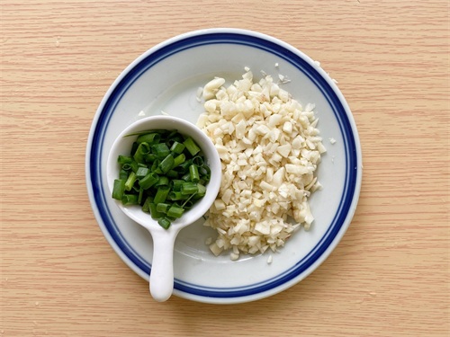 2.蒜剁成碎,香葱切小段备用。