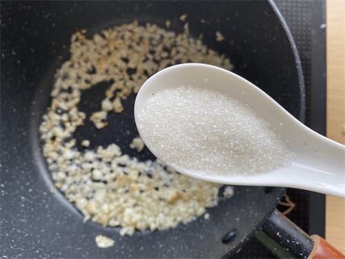 3.锅内倒入适量的胡姬花古法小榨花生油,放入蒜末爆香,加入白糖、生抽、蚝油,翻炒几秒盛出备用。