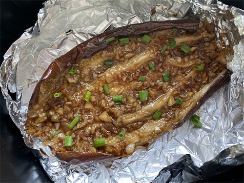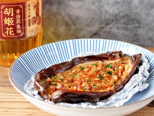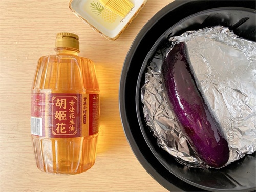 1.茄子洗净擦干水分,根蒂切除,无需去皮;炸篮中铺一层锡纸,将茄子放入,在茄子表面均匀地刷上一层胡姬花古法小榨花生油,送入空气炸锅180度烘烤20分钟。