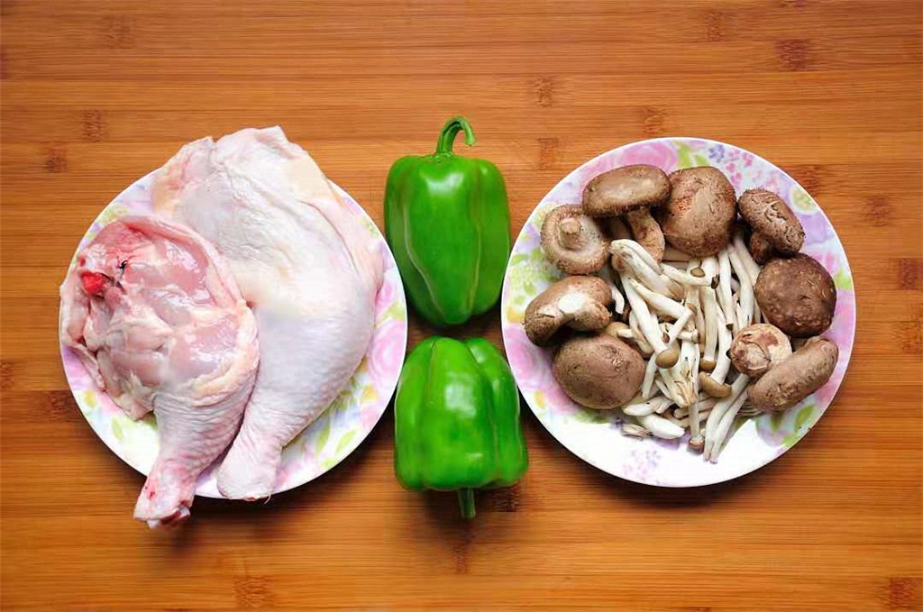 首先准备鸡腿2只,香菇9朵,其它菌类1把,青椒2个,白胡椒粉半勺,料酒2勺,食盐2勺,生抽1勺,豆瓣酱半勺,黄豆酱半勺,冰糖3粒,老抽1小勺,桂皮1块,八角1个,香菜2根,姜蒜适量。