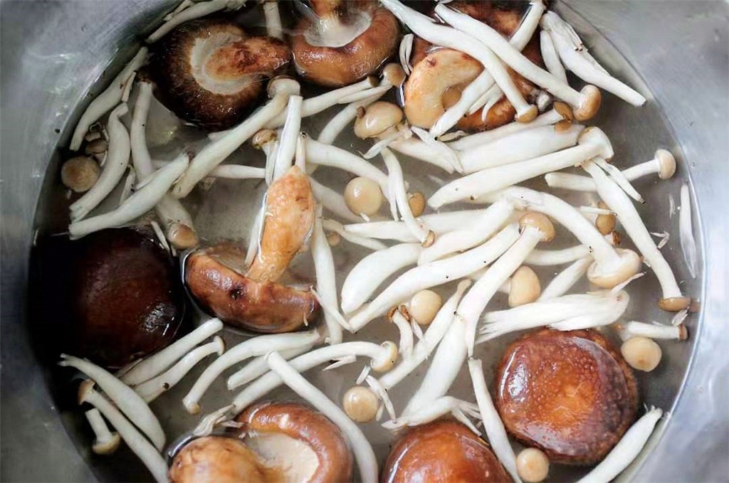 第二步,把所有的菌类放在盆里,加入清水,放入一勺食盐,搅拌至融化,用这淡盐水浸泡十分钟,目的是去掉菌类的土腥气,还有菌类都是长在泥里,上面会有泥沙,这样比较容易清洗掉。