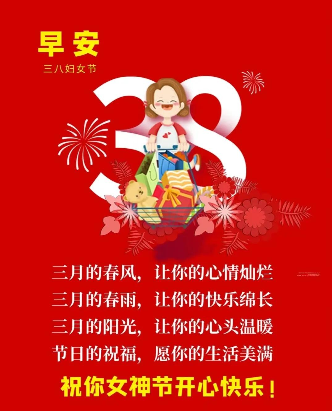 阳春三月,最好的季节,最好的你,送你三月的清风,吹走忧愁烦恼。送你三月的细雨,滋润幸福快乐。送你三月的鲜花,点缀美好生活。送你三月的暖阳,愿你灿烂明媚。三八女神节快乐!