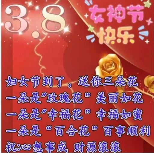 三八女神节,送女神们六朵花,一朵玫瑰花,愿你幸福美满。一朵百合花,愿你心想事成。一朵如意花,愿你吉祥顺遂。一朵幸运花,愿你好运相伴。一朵平安花,愿你安康喜乐。一朵快乐花,愿你开心无忧。节日快乐!