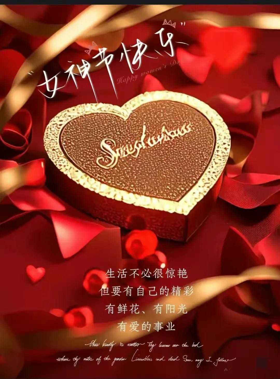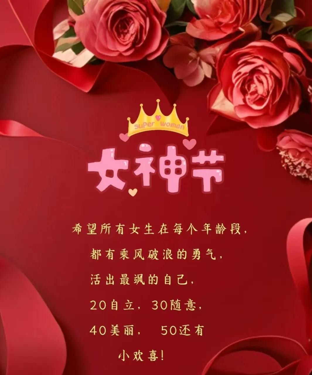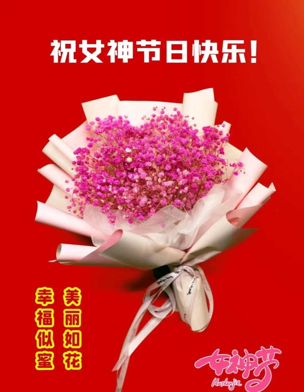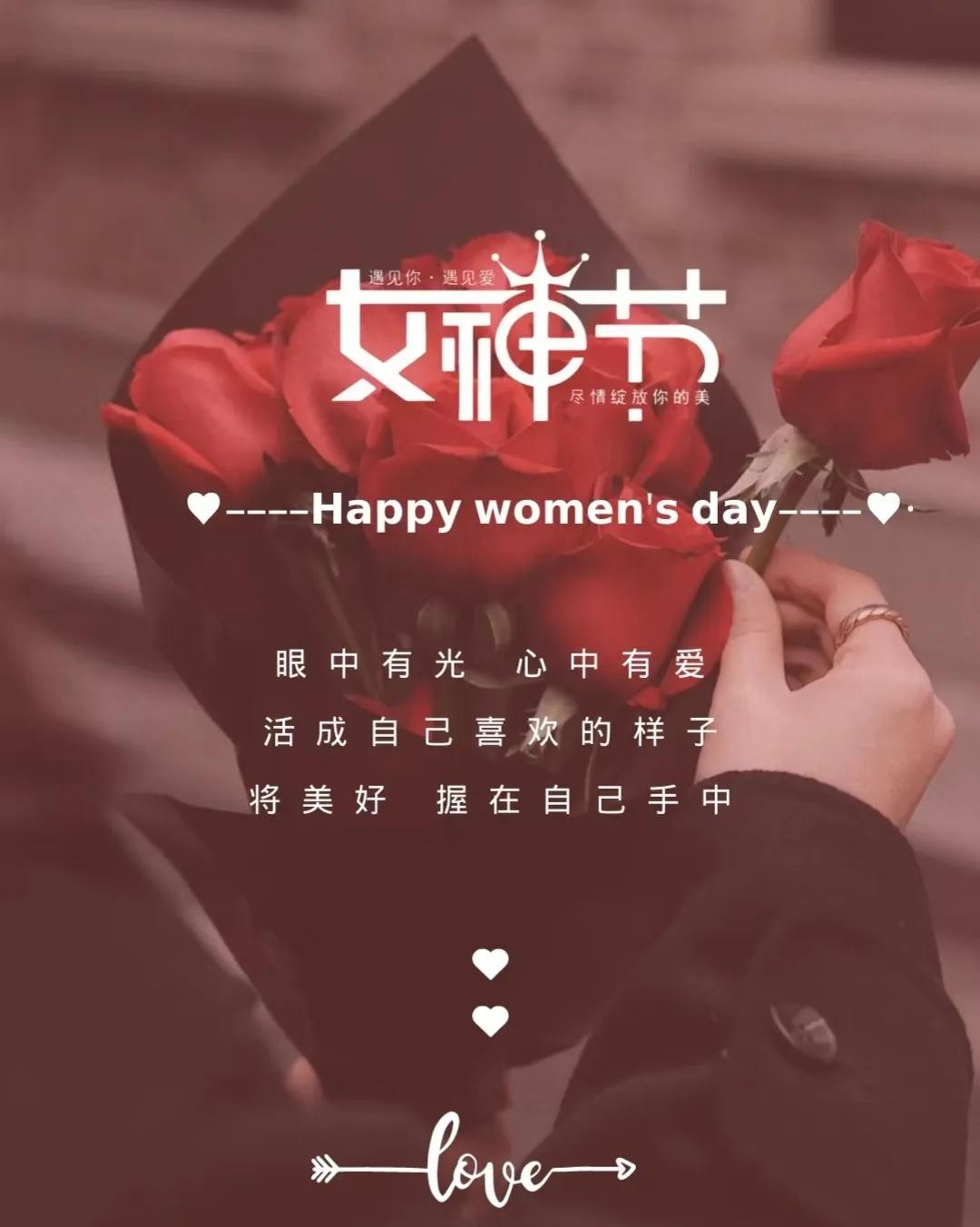 一份甜蜜的问候,一份美好的祝福,送给三八妇女节的各位女神们,愿好运围绕你,福气笼罩你,吉祥陪伴你,幸福拥抱你,快乐跟随你。祝大家节日快乐,幸福安康!