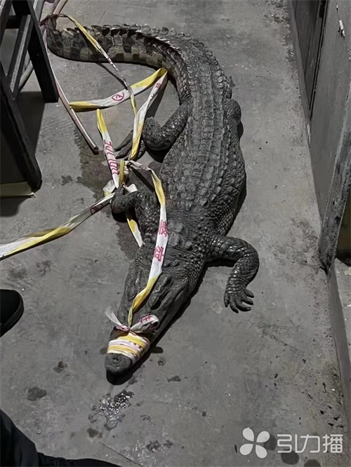 5月3日下午2点半左右,常熟市公安局任阳派出所接到村民求助,称在河道内发现了鳄鱼。现场隐约可见一条鳄鱼浮于河道内,体长超1.5米,样子凶猛,具有攻击性。为防止鳄鱼逃窜伤人,民警立即联合现场村委工作人员、农业农村局执法人员研究抓捕方案,决定由水性好的村民划着小船慢慢靠近,利用网具将鳄鱼罩住后转移至岸上。之后,众人用绑绳将鳄鱼的嘴巴、四肢固定住。很快,鳄鱼被成功捕获。