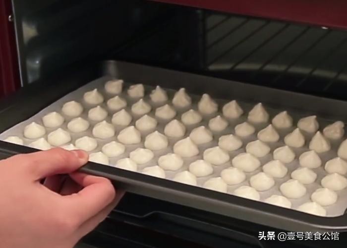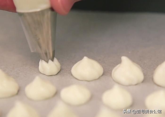 第六步:之后准备一个烤盘,铺上一层防粘纸,把裱花袋内的面糊挤出一颗颗小小的奶豆,均匀平铺在烤盘上。