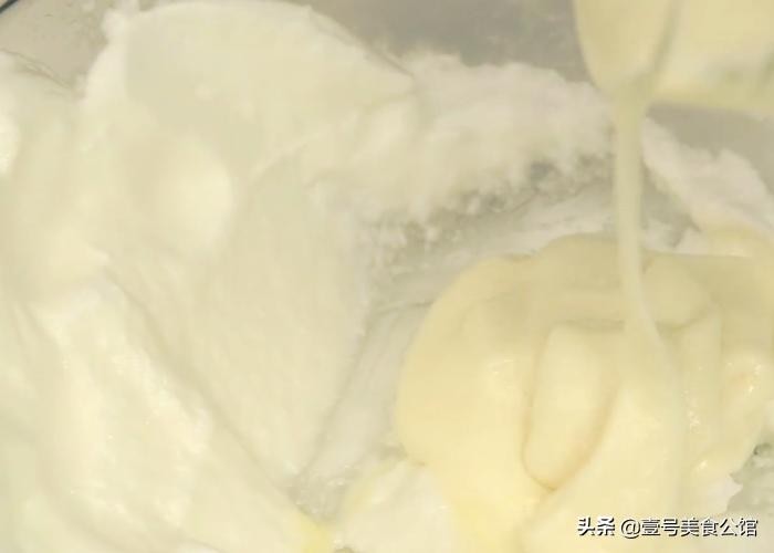 第三步:把准备好的玉米油、配方奶粉、淡奶油,倒入一个碗中,可以用勺子不停搅拌,也可以用打蛋器打制一下,直至形成和蛋白霜差不多粘稠状的状态。对于这步而言,如果家中没有淡奶油的话,也可以用三个鸡蛋的鸡蛋清,按照正常做蛋糕的打发程序,打制成蛋白霜也是一样的。但要记住的是,打发的时候要适当加一些柠檬汁进去哦。