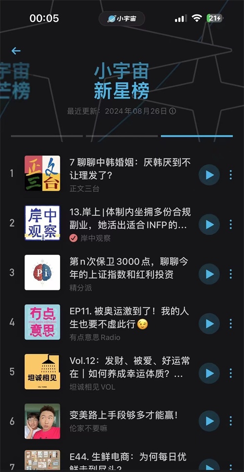 “岸中观察”第13期登上新星榜。图源:小宇宙APP