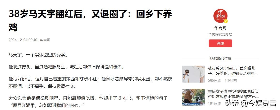 信源②——2024-12-04——华商网——38岁马天宇翻红后,又退圈了:回乡下养鸡