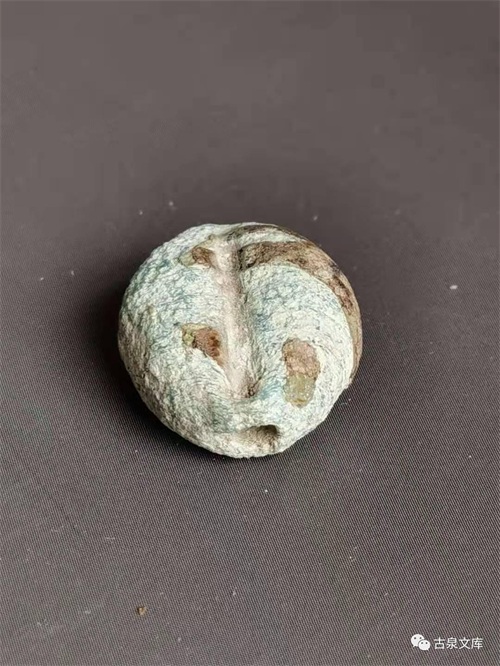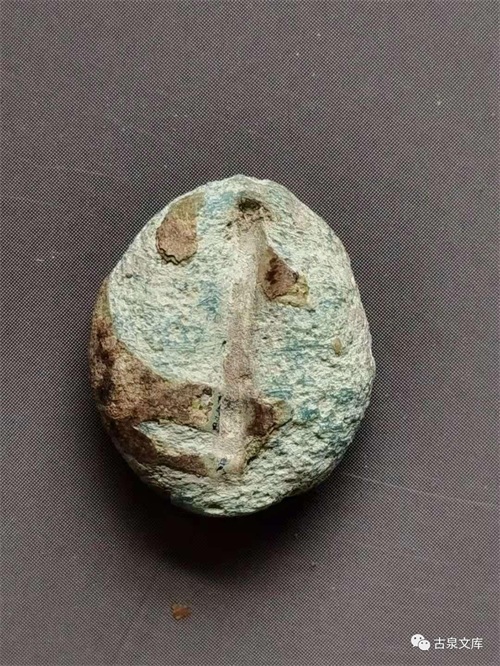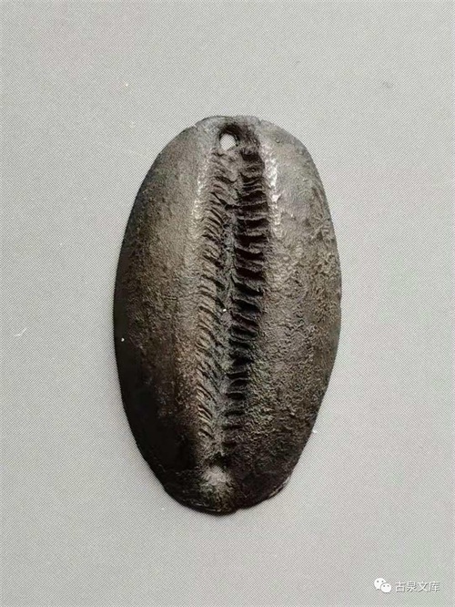 由于工艺上的限制,先秦时期琉璃多为各种小件,如珠、管、环等,常见的有“蜻蜓眼”珠等。王进在《女娲的遗珍-琉璃》(重庆出版社,2008年)介绍到:春秋战国时期,“制造工具大多已更新为以铁质为主,琉璃的色彩也转为以浅绿色为多,这和制造工具中掺杂着少量的铁有着密切的关系”。笔者收藏的一枚琉璃贝(见图35、36),除具有明显贝币特征外,有一通芯穿(见图37、38),便于穿系,保留了琉璃珠的特征,色彩为浅绿色,应为铁器时代的产物。
