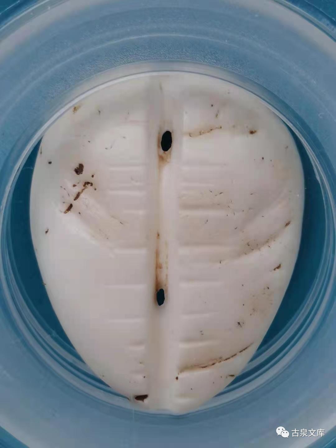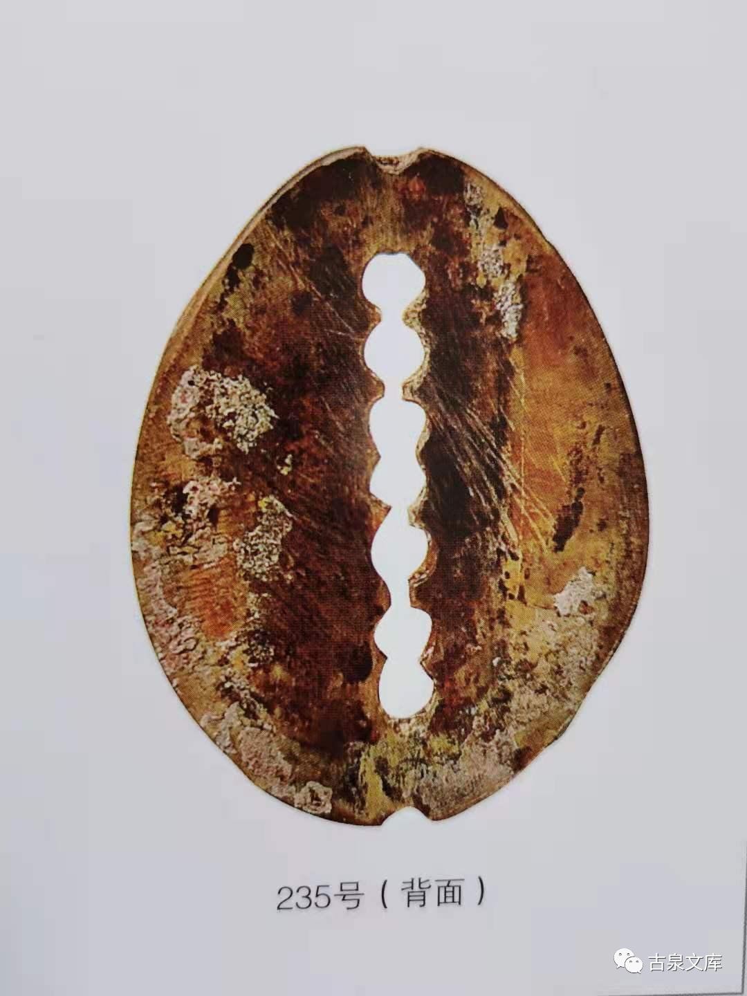 图35-38:琉璃贝 春秋战国,整体呈卵圆形,面鼓背平,竖槽,特点是腹部有一通芯穿,17.6*14.9*8mm,3.45g,惜背有一残洞(图36)