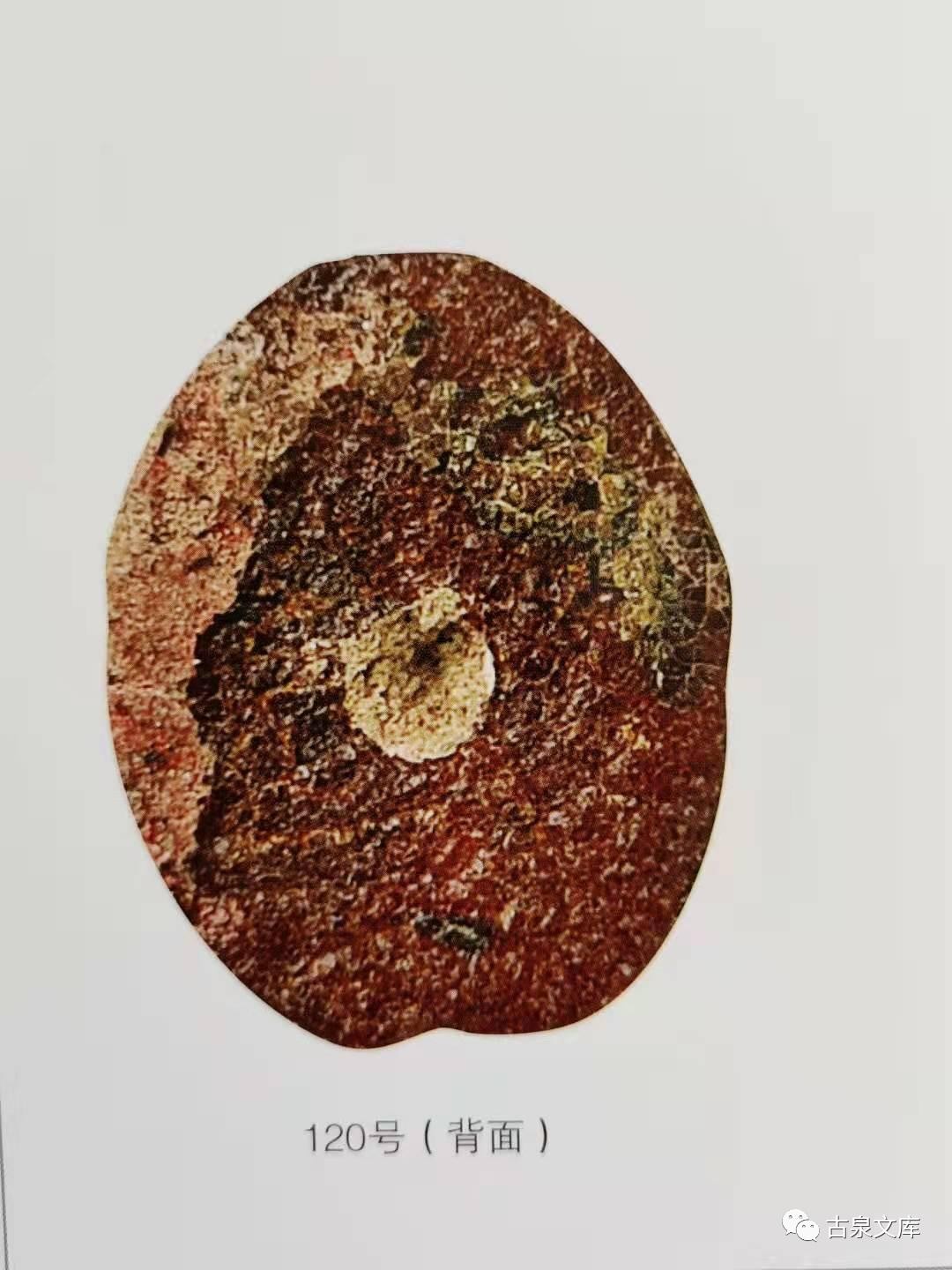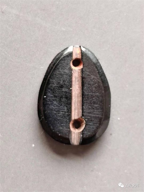 图39、40:角贝 通体面鼓背平,呈黑棕色半透明状,磨光,正面微鼓,中间开槽,槽内有7个连珠孔,1.93*1.61*0.35mm,1.21g(图片来源:孙永行《齐地贝币》,齐鲁书社,2014年)