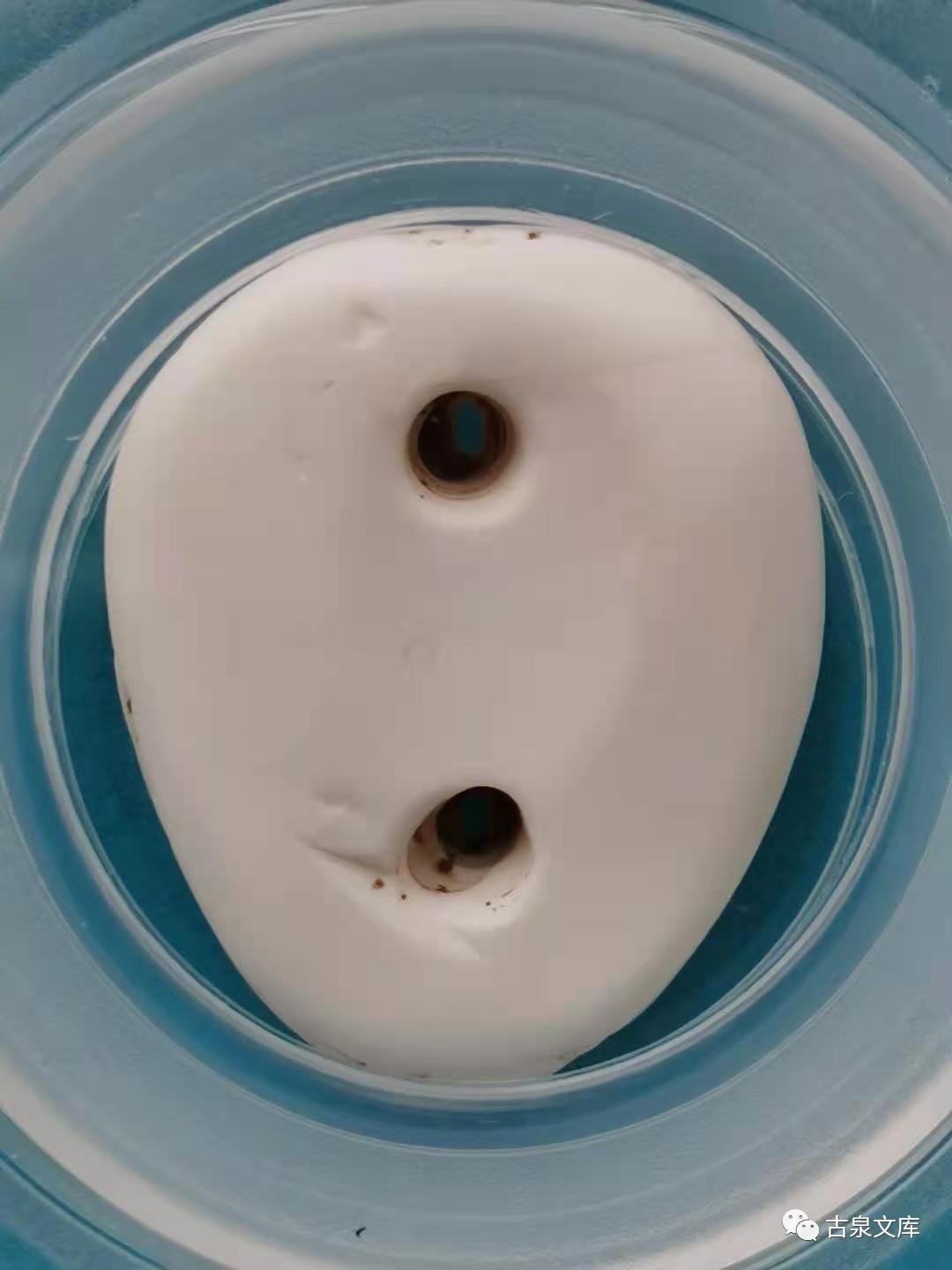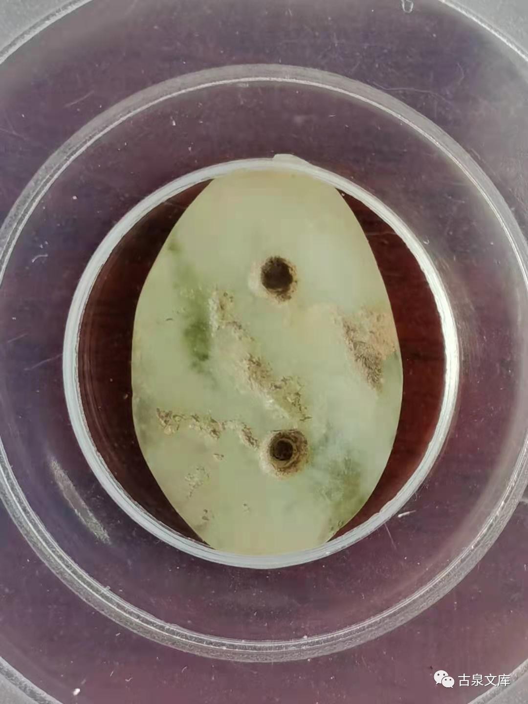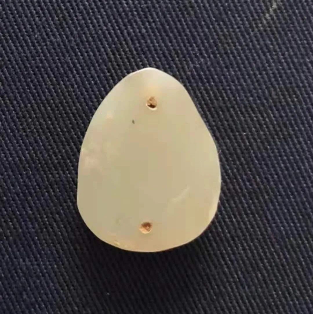 图7、图8:和田玉贝 春秋战国,整体面鼓背平,直槽无齿,双穿,21.6*16.6*4.6mm,2.52g(作者孙永行藏品)