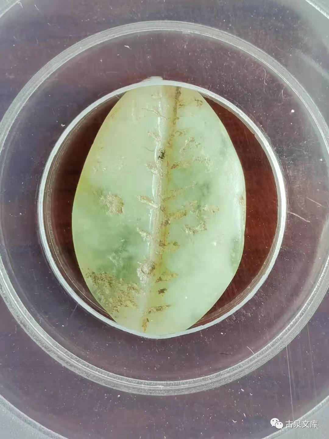图3、图4:地方硬玉贝 春秋战国,整体面鼓背平,硬度高,有翠色,直槽斜齿,双穿, 16.6*11.2*2.6mm,0.7g