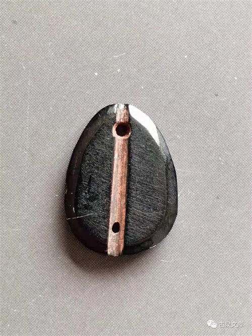 图29、30:煤玉贝 春秋战国,整体扁平,正、背面皆刻有竖槽,双穿,14.7*10.8*3.3mm,0.43g