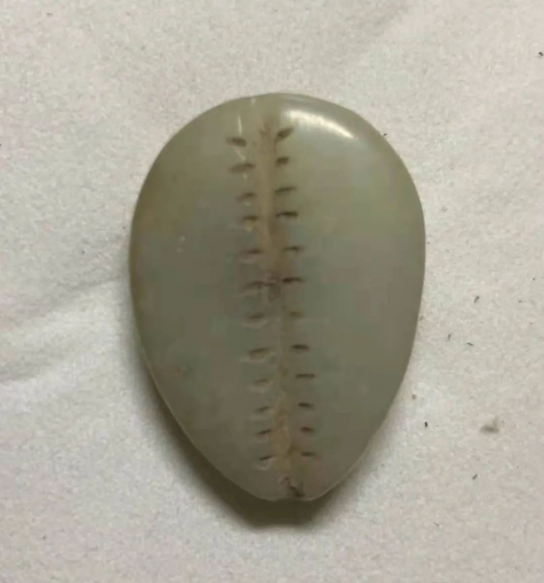 图9、10:和田玉贝 商周,整体略呈卵圆形,直槽横齿,单穿,29.1*21.4*10.3mm,9.52g(作者孙永行藏品)