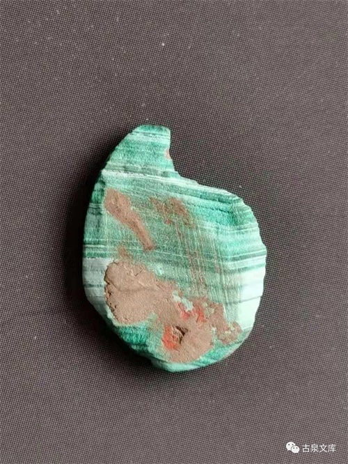 图13、14:孔雀石贝 西周春秋,整体面鼓背平,直槽斜齿,有朱砂痕,惜尖部有残,16.5*12.0*3.0mm,1.13g