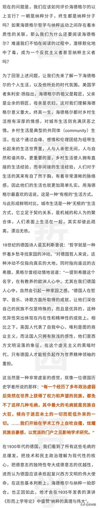 第三,海德格尔表现出一定的排犹倾向。比如,他与具有犹太血统的恩师胡塞尔中断了关系,在后者重病期间以及葬礼上均未露面,非常不近人情;此外,他通过打小报告暗示一位学者与犹太人有牵连,阻止该学者谋得教职。