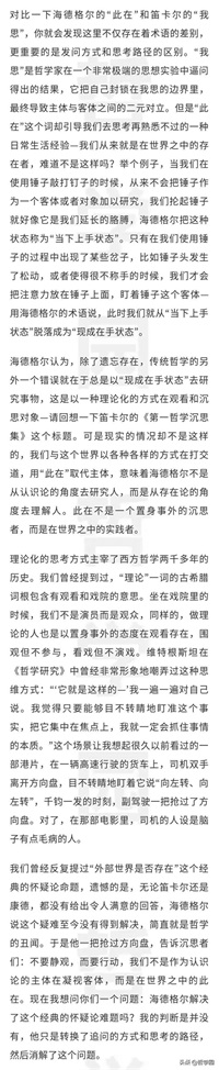 我们要牢记于心的是,此在不是笛卡尔式的反思主体,它没有被局限于唯我论的界线之内。此在不去追问外部世界是否存在的问题,因为它已然在世界之中;此在也不去探讨他人心灵是否可知的问题,因为它在日常的烦忙和烦神中,已经消融在与他人的共在里。