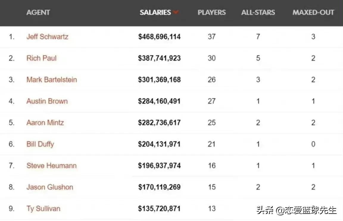 美媒发了一份过去一年NBA经纪人业绩排行榜,然而赫然出现在你面前的第一名不是里奇保罗而是“杰夫-施瓦茨”。