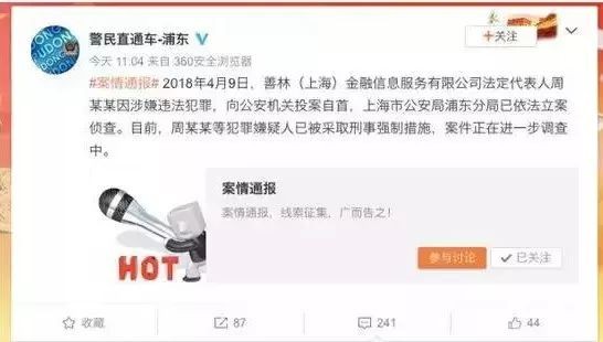 4月11日上午,上海市公安局浦东分局官方微博通报称,2018年4月9日,善林(上海)金融信息服务有限公司法定代表人周某某因涉嫌违法犯罪,向公安机关投案自首,上海市公安局浦东分局已依法立案侦查。目前,周某某等犯罪嫌疑人已被采取刑事强制措施,案件正在进一步调查中。