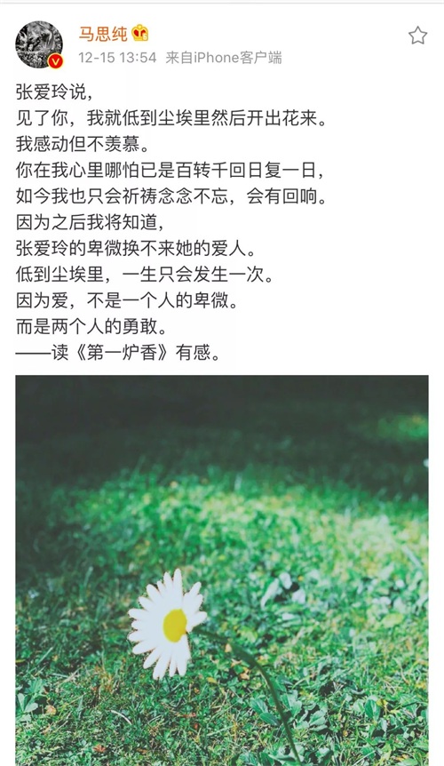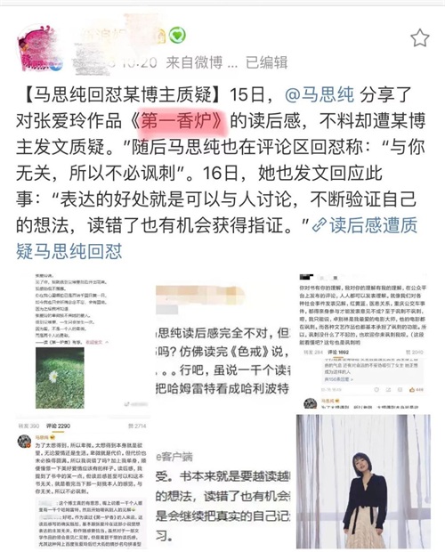 上个周末,演员马思纯因为在微博上发表了一段自己即将参演电影《第一炉香》原著的读后感,引来博主“衣锦夜行的燕公子”的吐槽,也引起众多张爱玲书粉的围观。