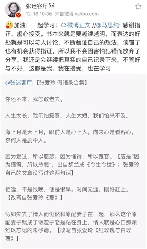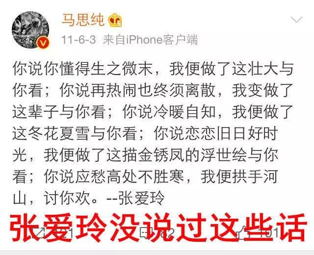 甚至,还引发了张爱玲粉丝大号开扒关马思纯以往微博中,引用过的“张爱玲语录”的真伪性,这其中倒还真有很多张爱玲没说过的话。。。