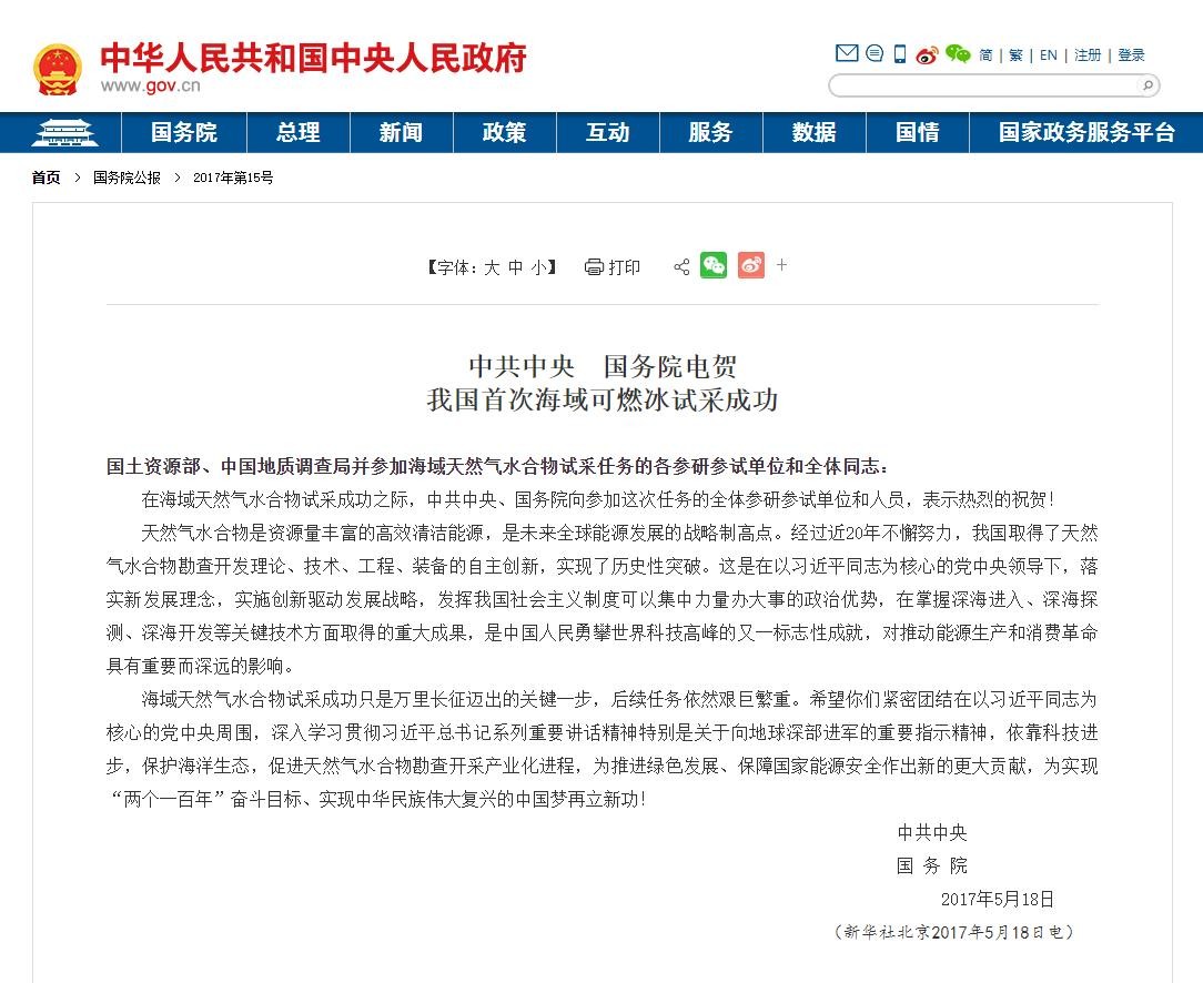 可燃冰试采成功之后,收到了中共中央、国务院发来的贺电,这也说明我国也非常关注可燃冰开采这件事。