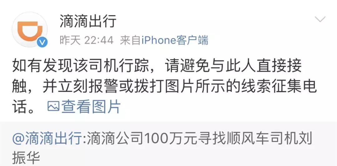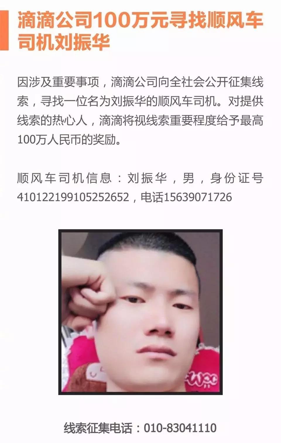 10日晚,滴滴宣布悬赏100万元寻找杀害该乘客的顺风车司机,并公布了这名顺风车司机的姓名、身份证号和电话信息。滴滴方面表示,如发现这名司机的行踪,请避免与此人直接接触,并立刻报警或者拨打线索征集电话010-83041110。