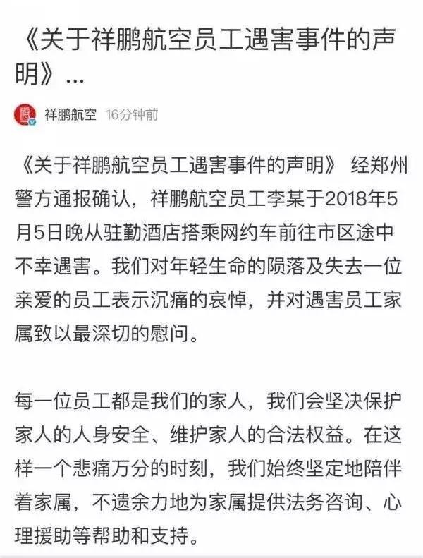 10日下午,遇害空姐所属公司祥鹏航空发声明慰问,并呼吁广大民众提供线索,早日将案件侦破。