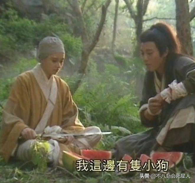 还有吕颂贤演的令狐冲遇到仪琳,两人在山里也是席地而坐,地上还放着西瓜,这个置景搭得也很一般般。
