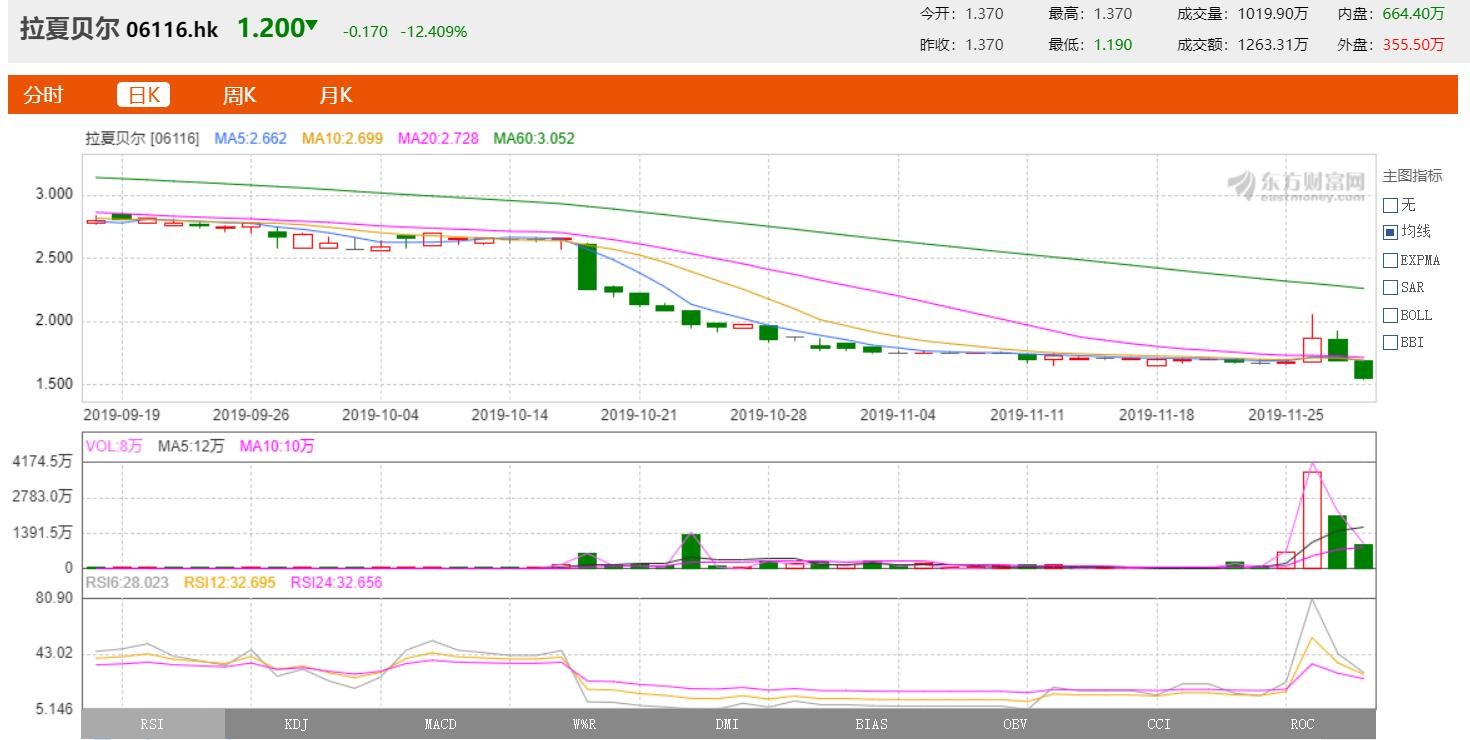 受消息影响,拉夏贝尔股价出现“急跌”。11月28日,A股拉夏贝尔开盘跌停,股价收报4.77元。港股拉夏贝尔也连跌两日,27、28两日下跌幅度分别为13.84%,12.41%。连涨连跌之后,拉夏贝尔近期股价呈现“尖帽子“走势。